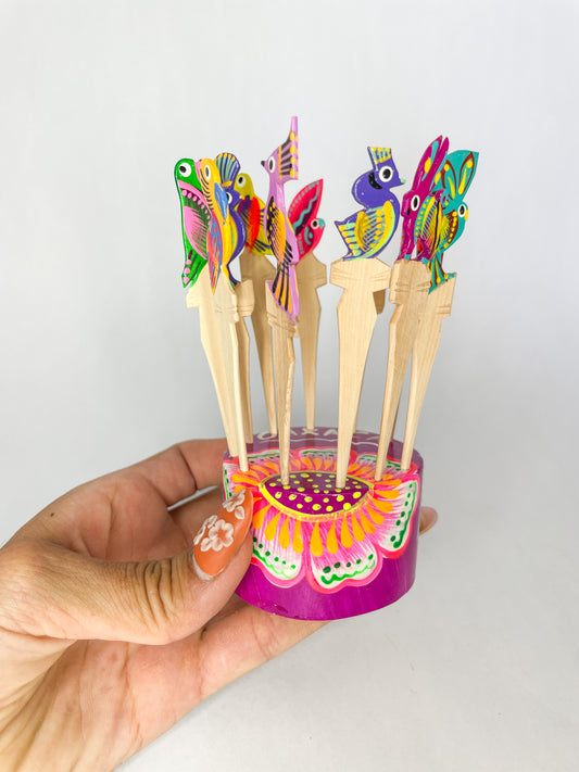 Handmade Alebrije Appetizer Toothpicks with Wooden Base Reusable Toothpicks Palillos