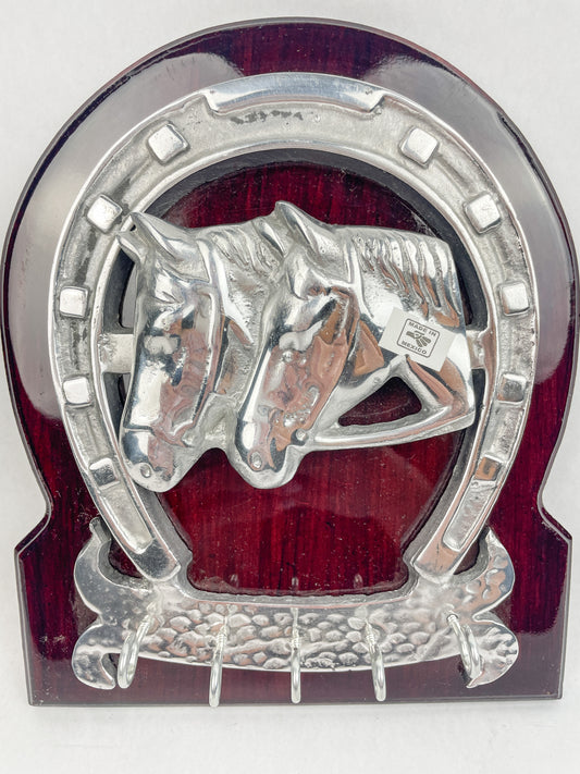 Horseshoe Key Holder Wooden Frame Pewter Metal Silver Horses