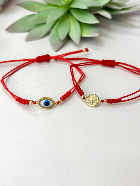 14K Solid Gold Red Cord Bracelet – Adjustable Protection Bracelet with Saint Benedict or Evil Eye