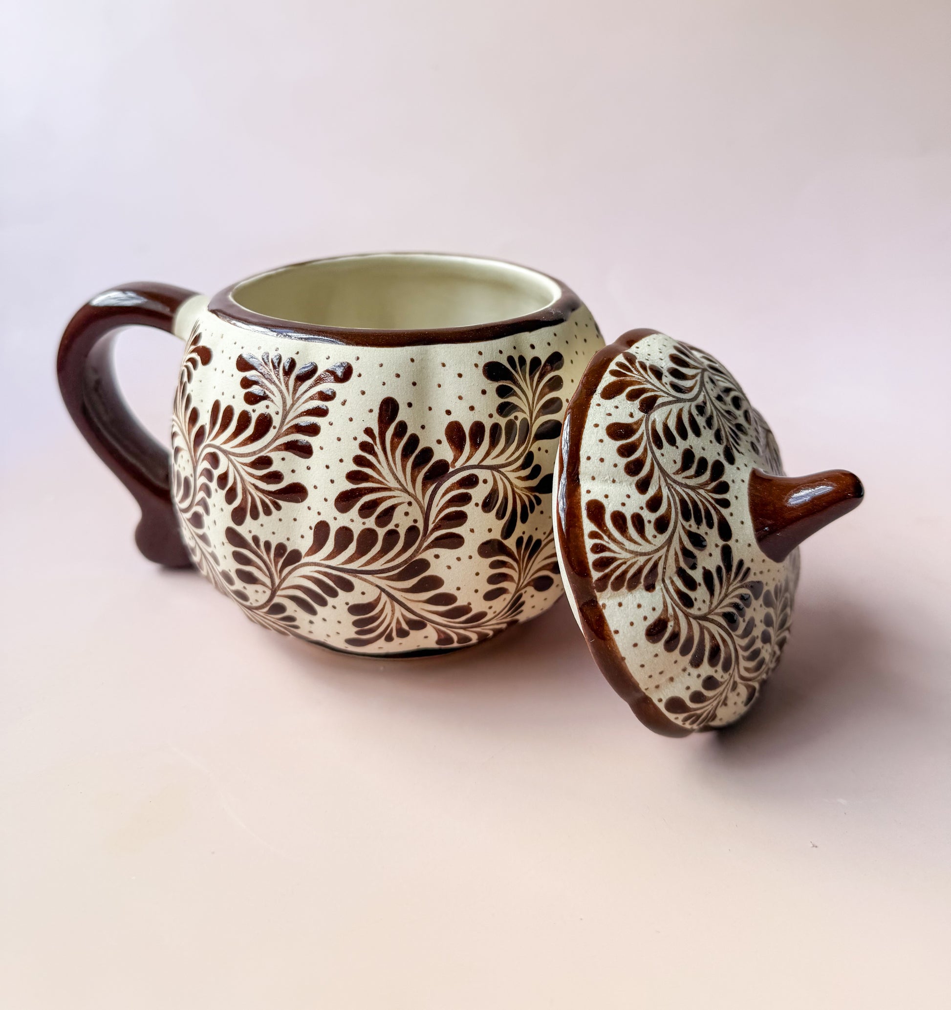 Featuring intricate floral designs and a charming pumpkin shape with a lid, it’s perfect for your favorite coffee, hot chocolate, or tea. The lid helps keep your drink warm — and your space stylish!