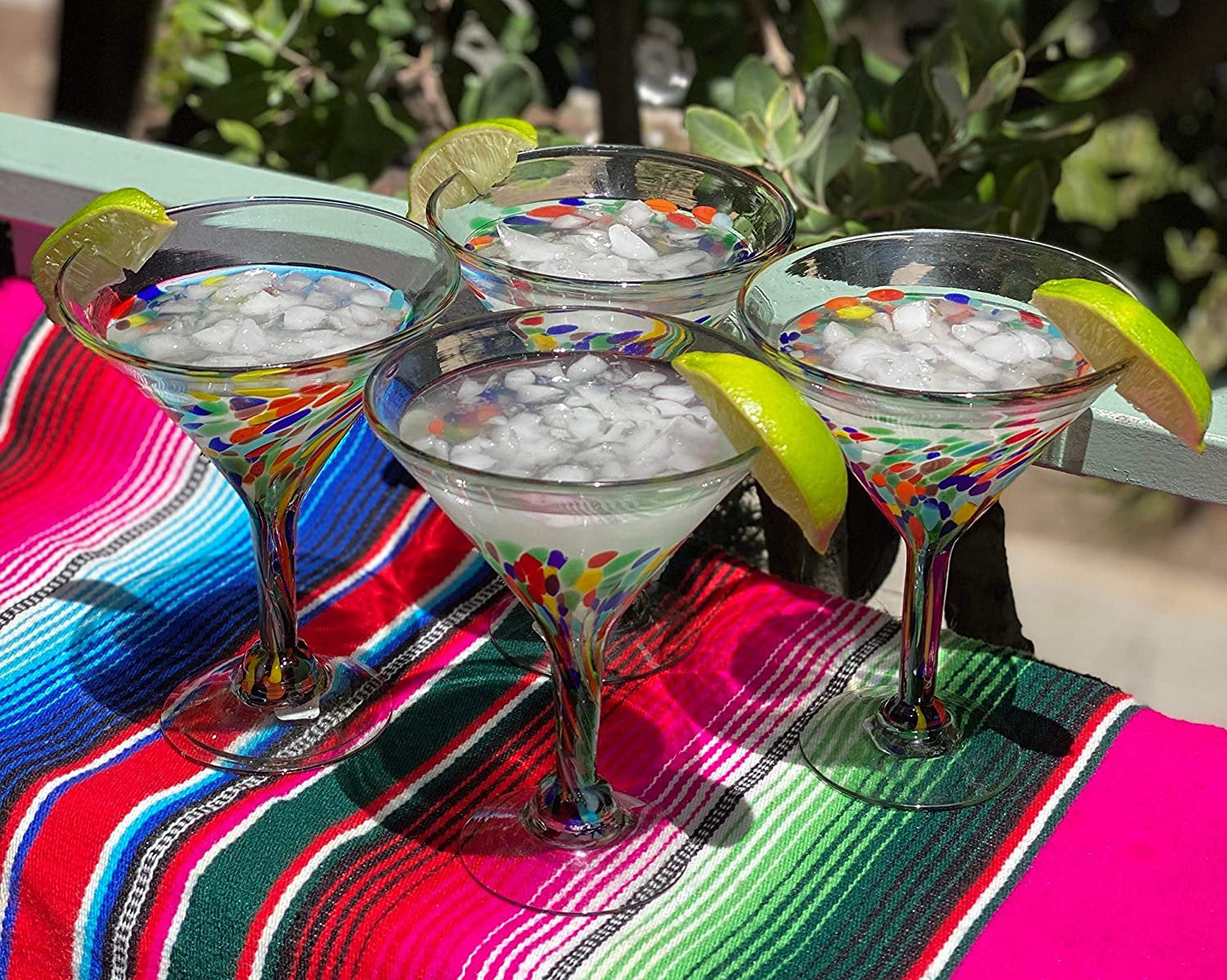 This modern set of 4 hand blown margarita glasses with a confetti swirl design is perfect for your next fiesta! Use them to serve tasty cocktails, lemonade, or your drink of choice. The martini style set adds a great sense of elegance to the dining room that will be enjoyed by everyone. Each blown glass may vary slightly in size and show tiny bubbles within the glass that develop from the blowing process. Lead-free, made from sustainable recycled glass. Hand washing recommended, but dishwasher safe on the top rack. Exceptional artisan quality, thick and sturdy glass. Proudly hand made in Mexico.