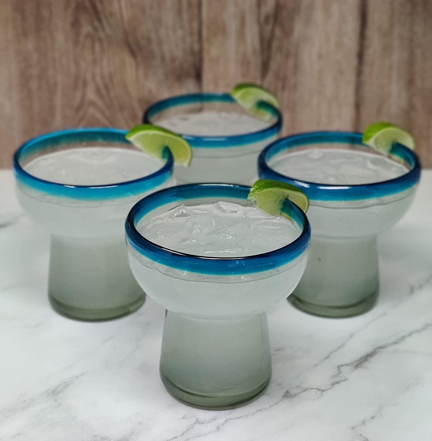 This set of 4 hand blown stemless aqua rim margarita glasses is perfect for your next fiesta!