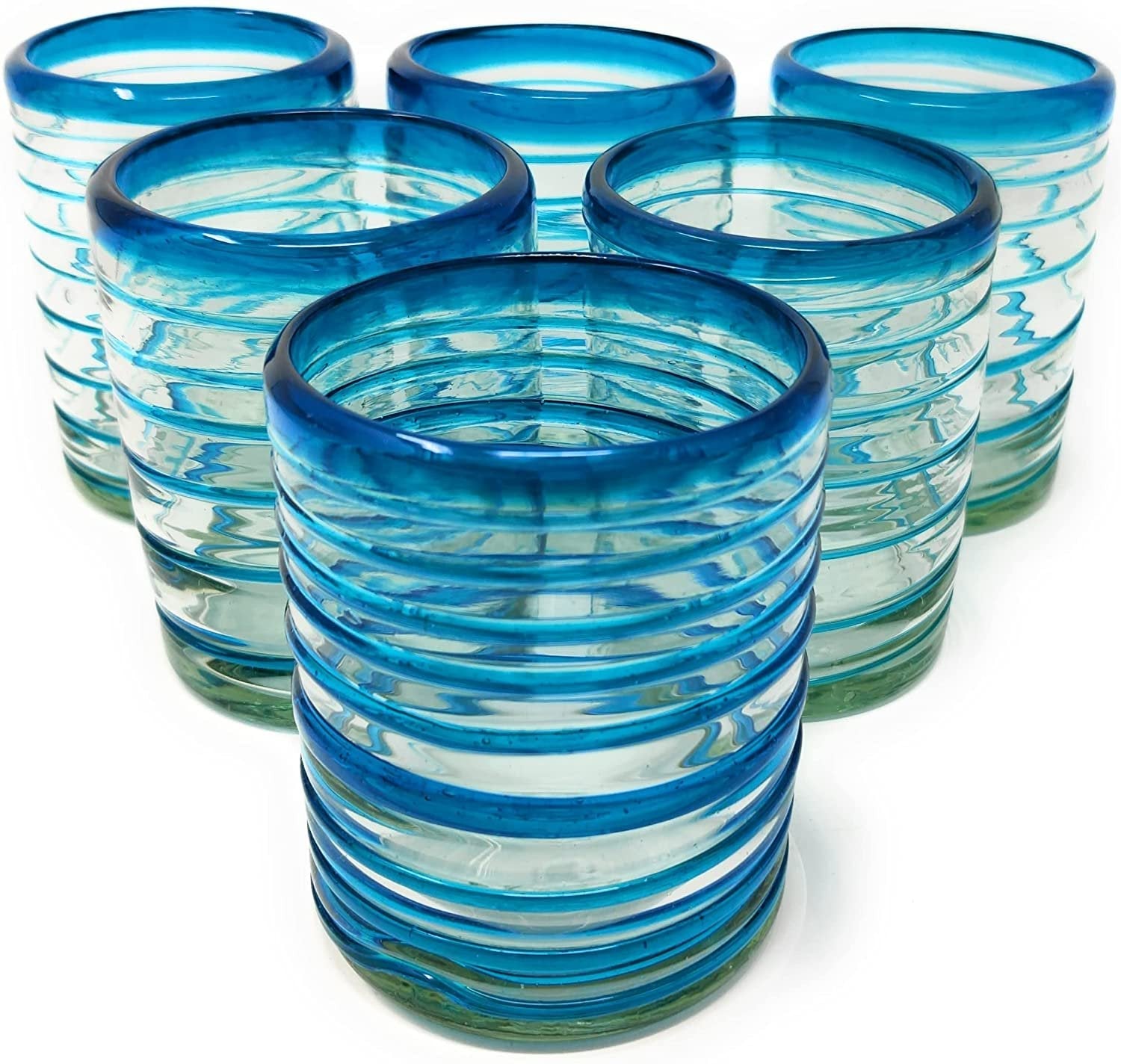 Hand Blown Mexican Drinking Glasses – Set of 6 Tumbler Glasses with an Aqua Spiral Design (10 oz each)