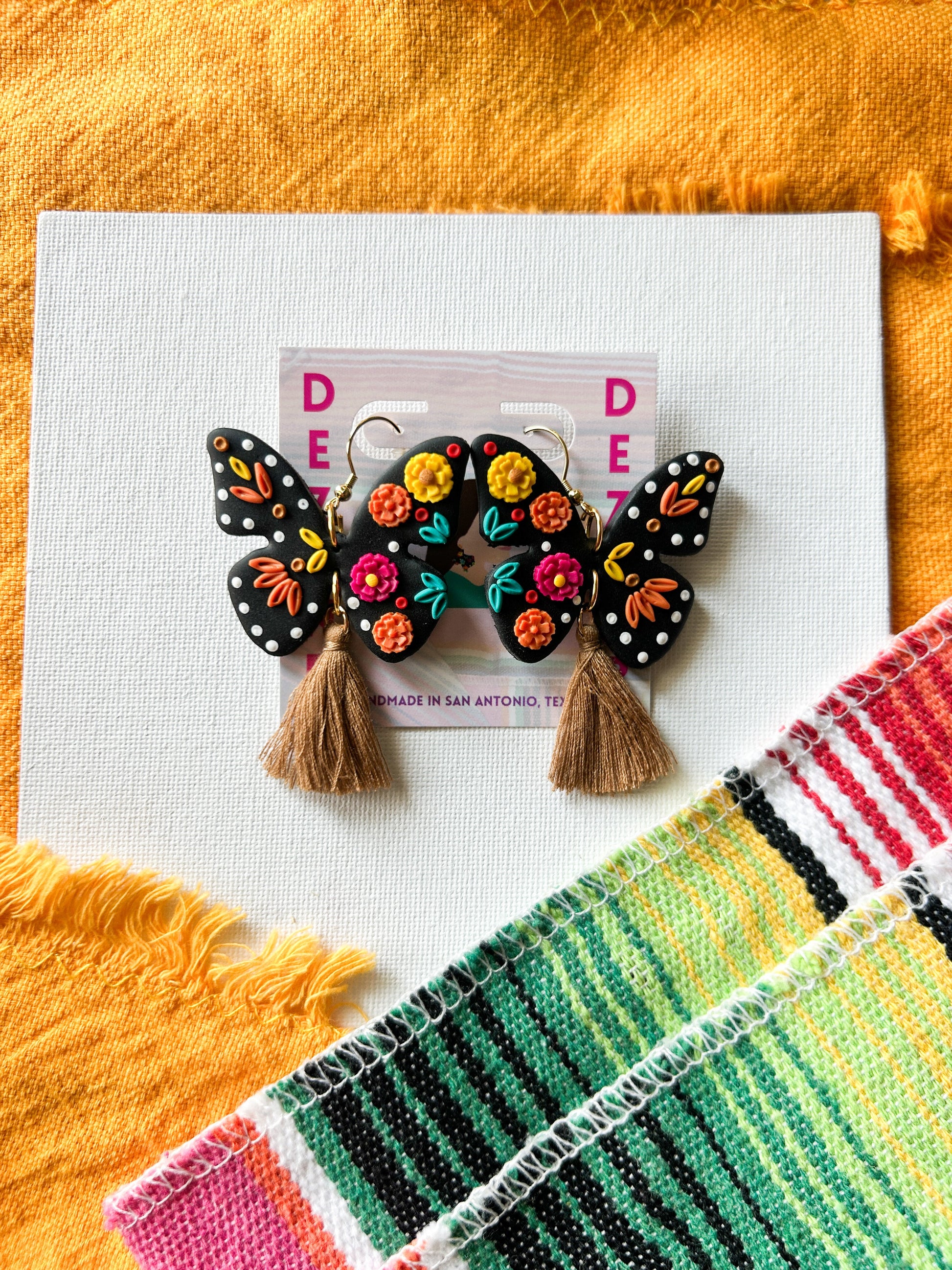 This pair of earrings is part of the Mexico City inspired collection. A unique monarch butterfly with vibrant and colorful florals as well as details of the beloved butterfly.