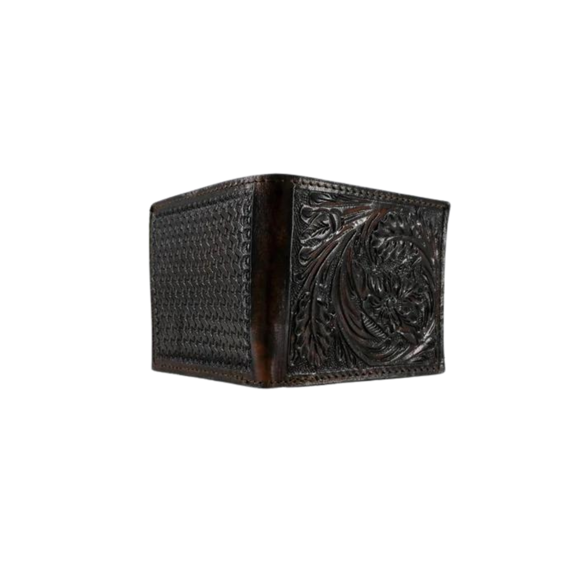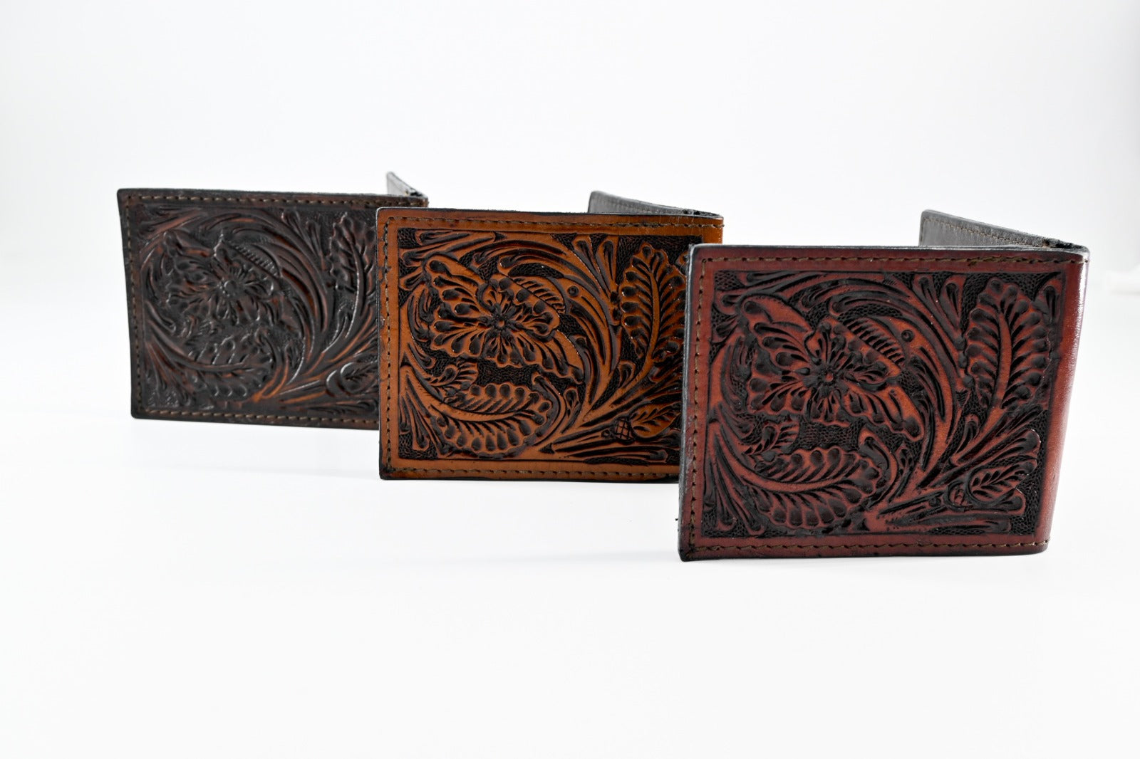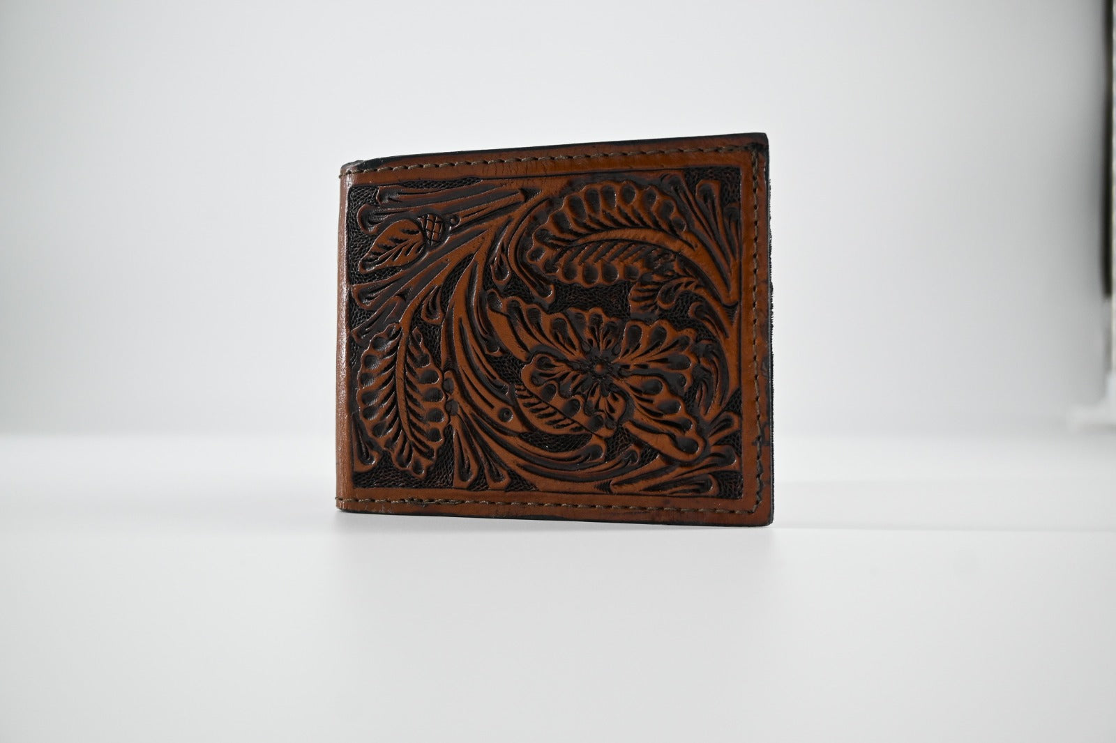 Handmade, hand-carved Leather Bi-fold Wallet designed by David Luna with intricate detailing.