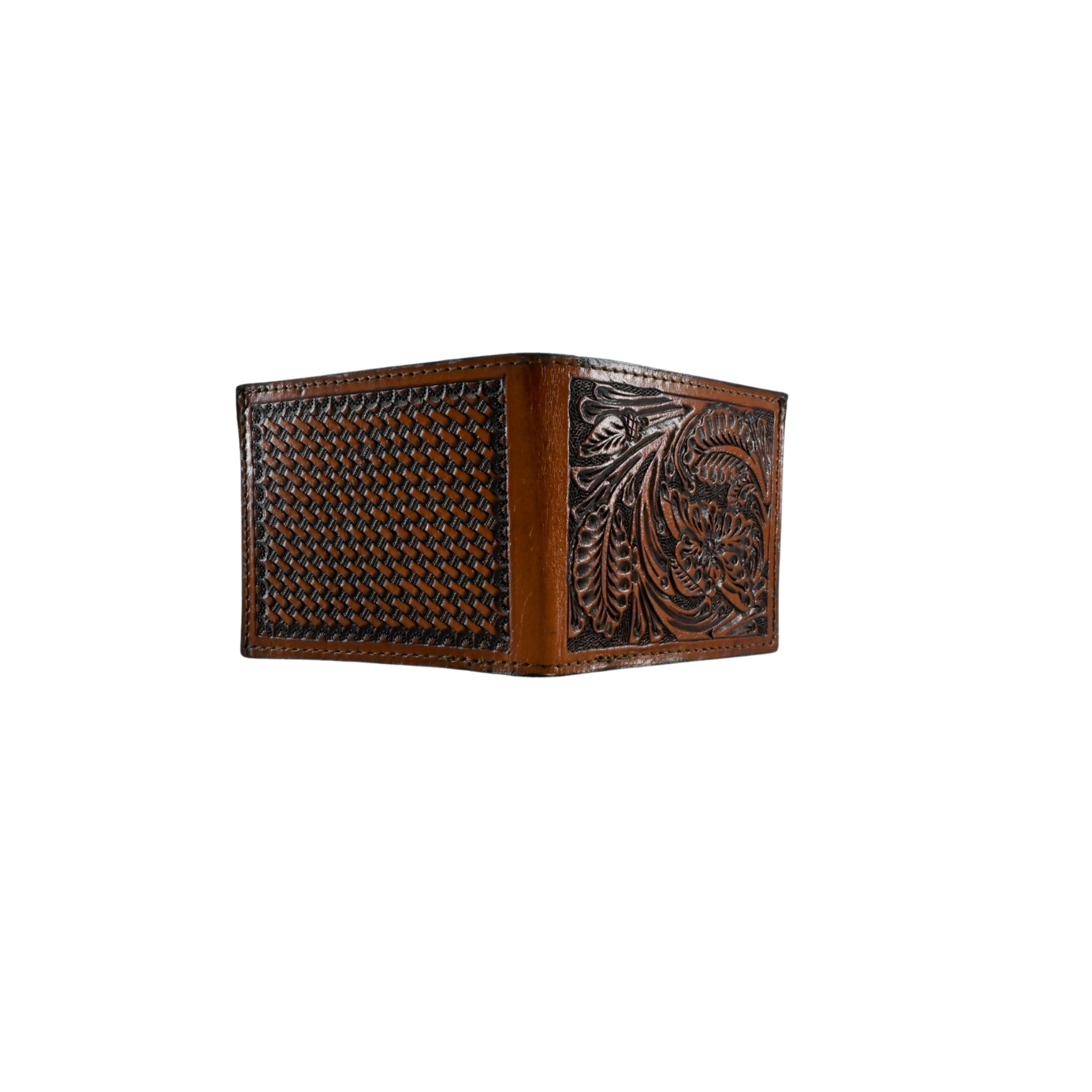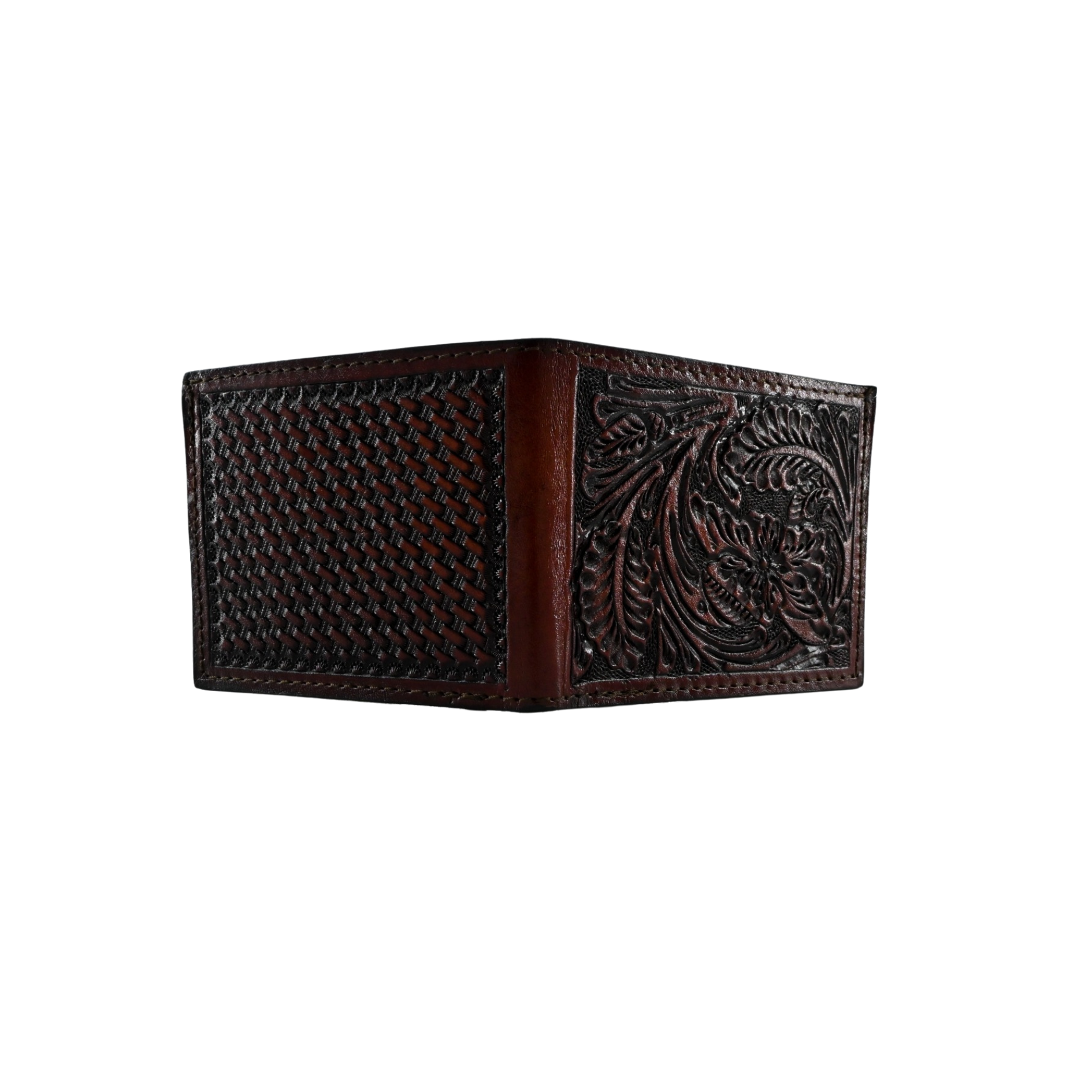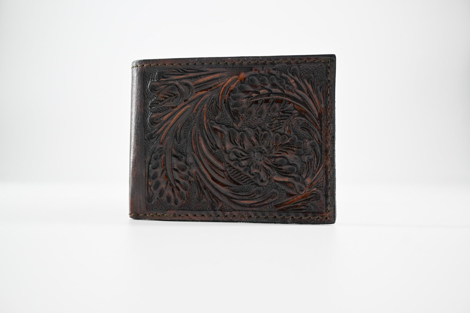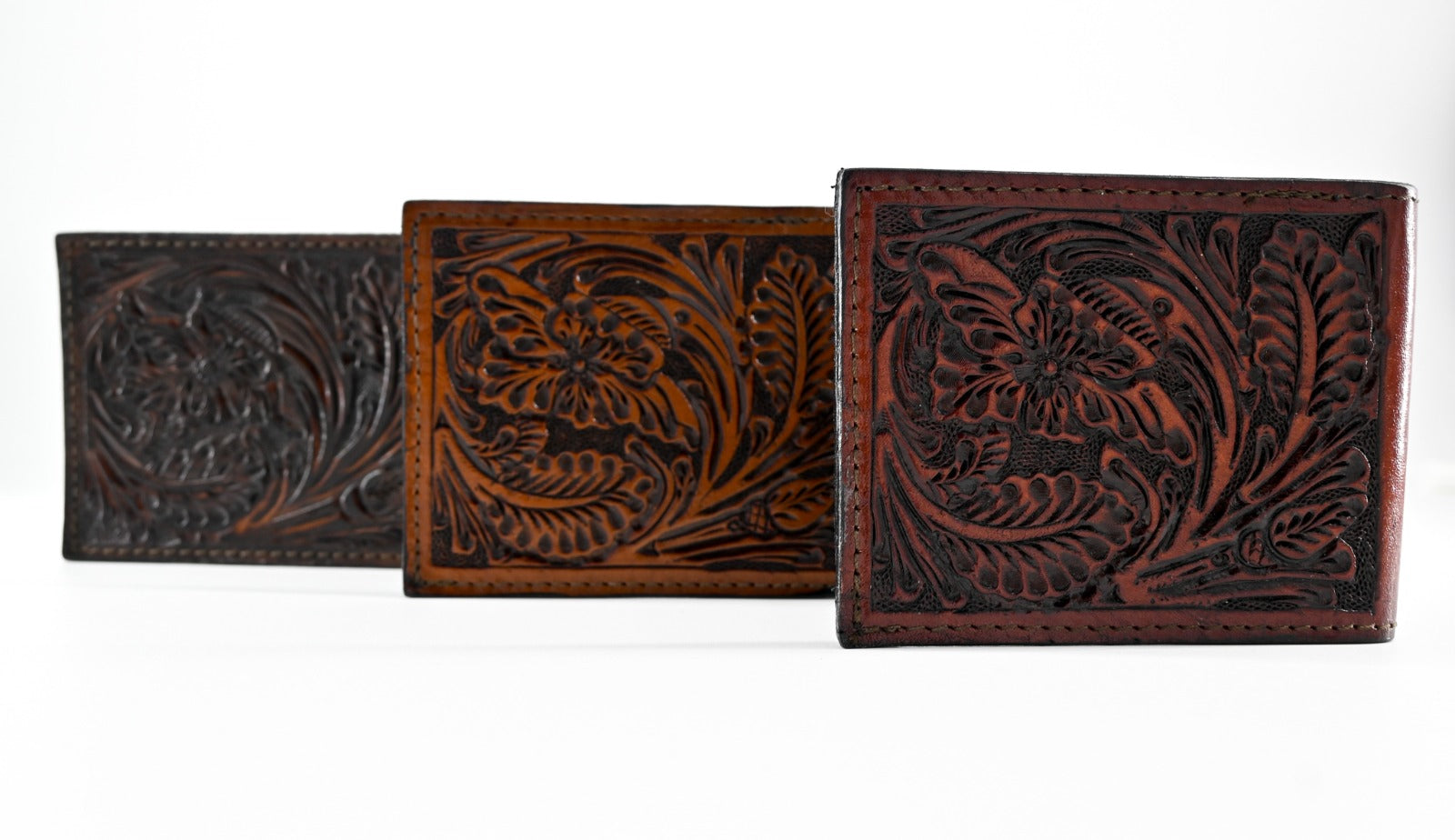 Handmade, hand-carved Leather Bi-fold Wallet designed by David Luna with intricate detailing.