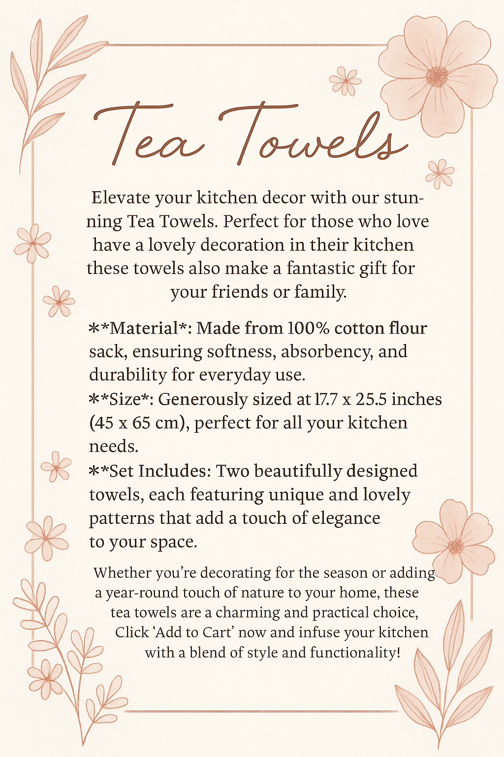 Crafted from 100% high-quality cotton flour sack fabric, these tea towels are soft, absorbent, quick-drying, and durable, making them as functional as they are beautiful. Their generous size of 17.7 x 25.5 inches (45 x 65 cm) makes them perfect for drying dishes, wiping hands, lining bread baskets, or adding a colorful decorative accent to your kitchen.