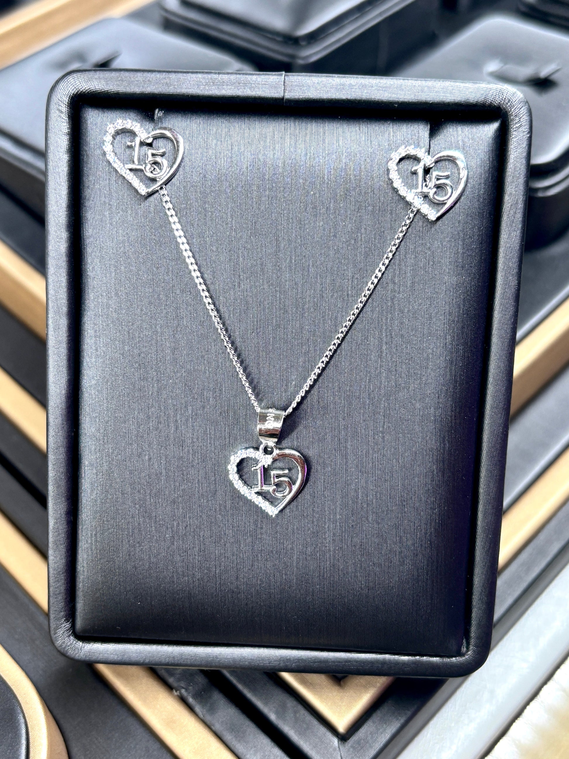 Quinceañera Jewelry Set Sterling Silver .925 – Necklace & Heart Earrings for Girls | Set de Joyería de Quinceañera Plata .925