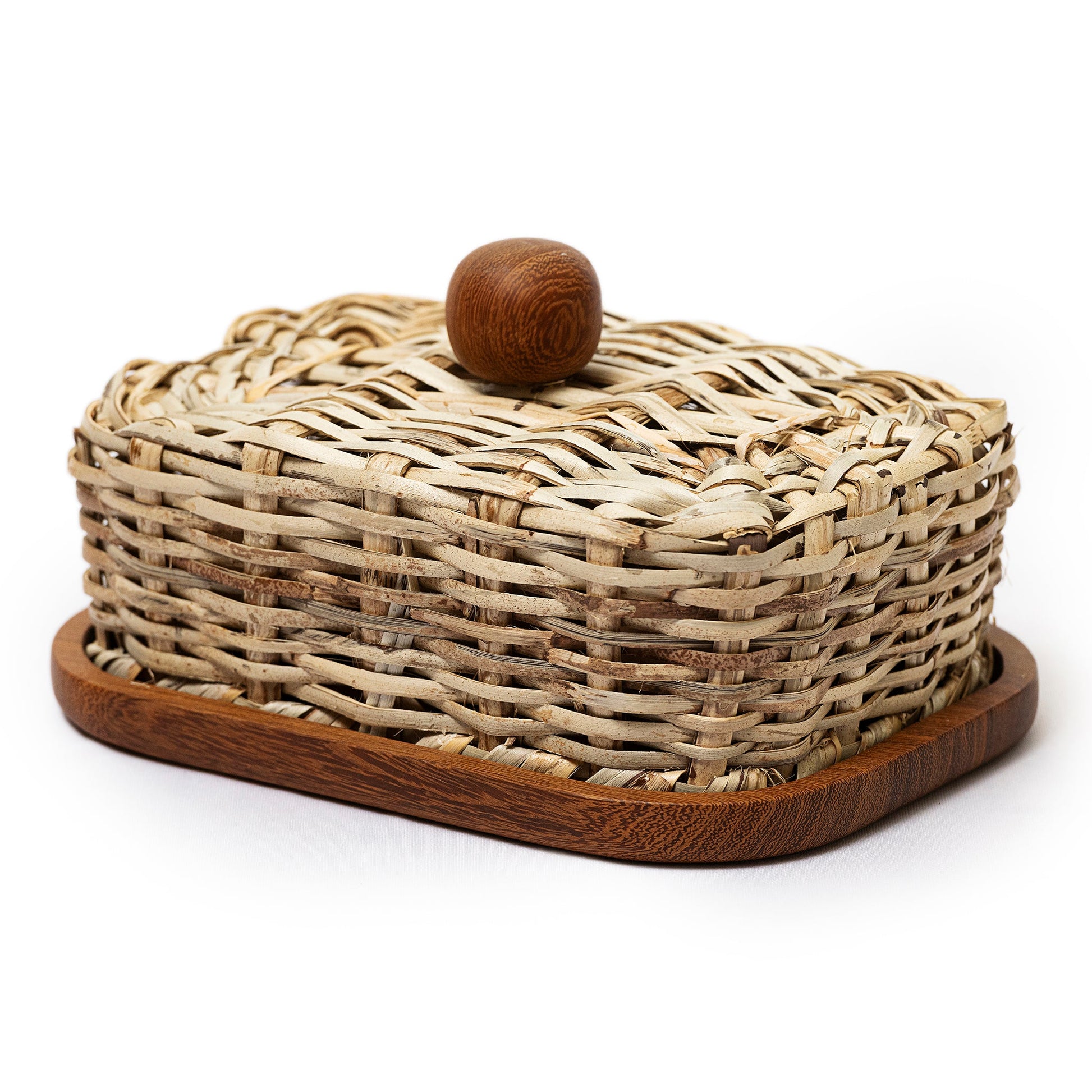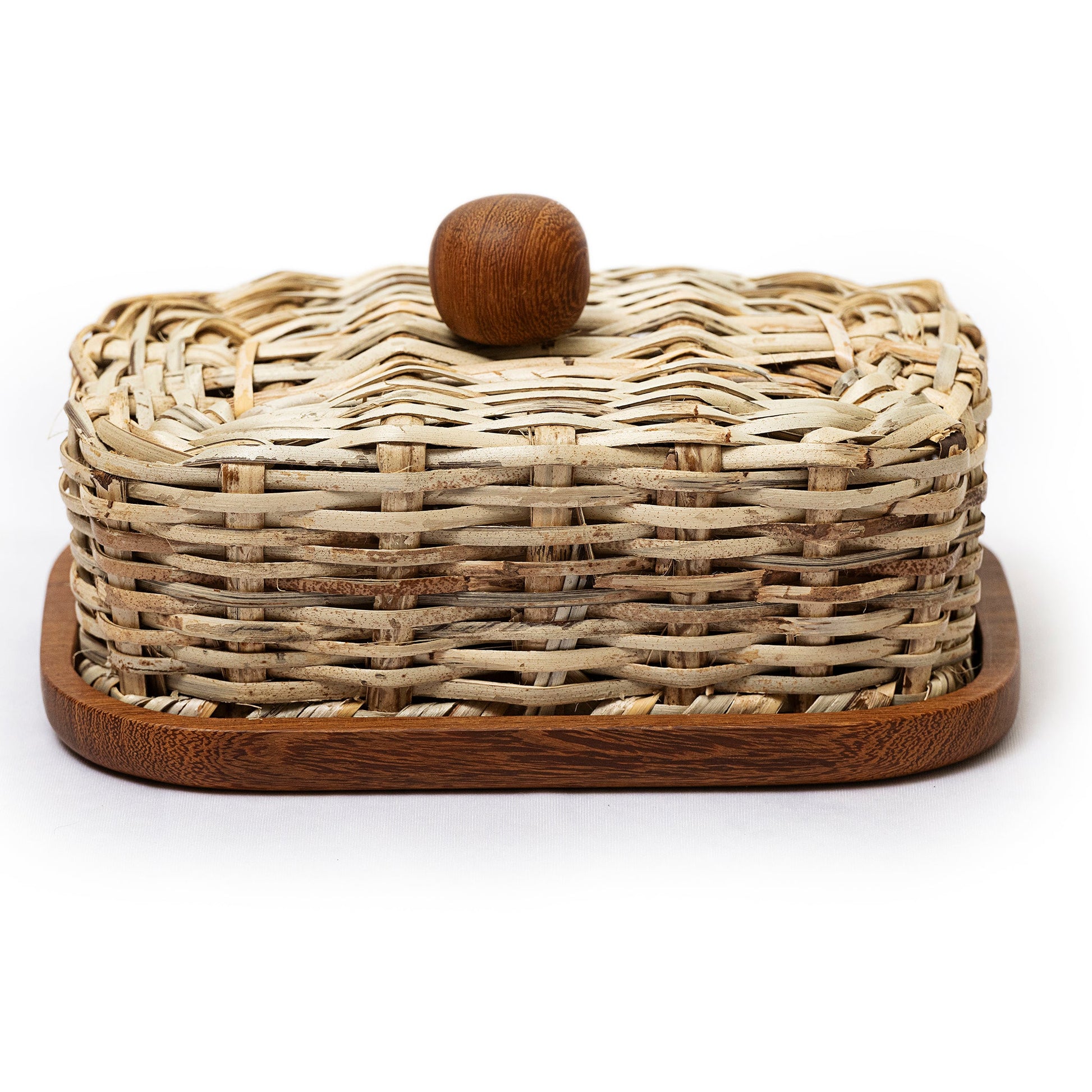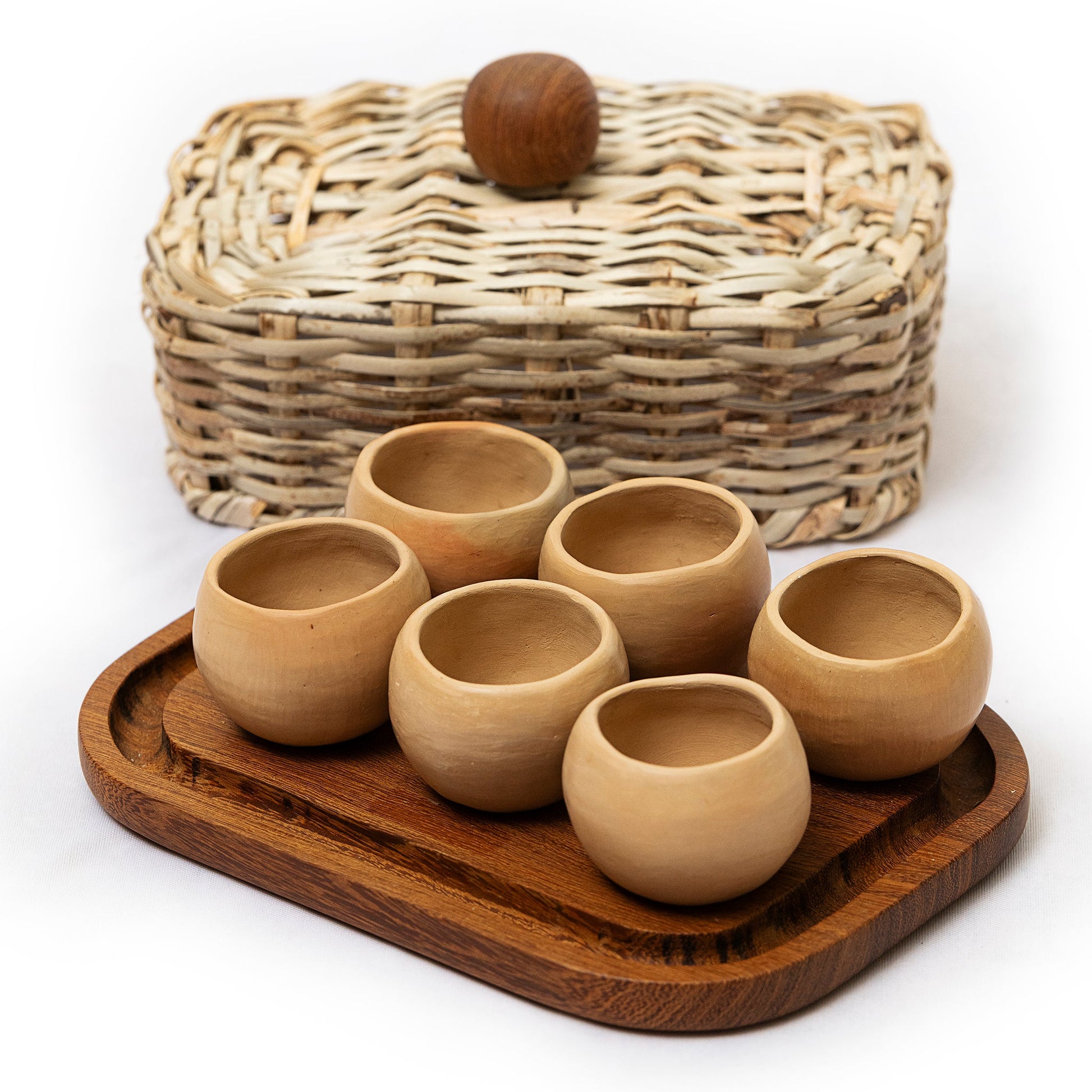 Includes 6 clay shot glasses with wooden base and handwoven palm lid