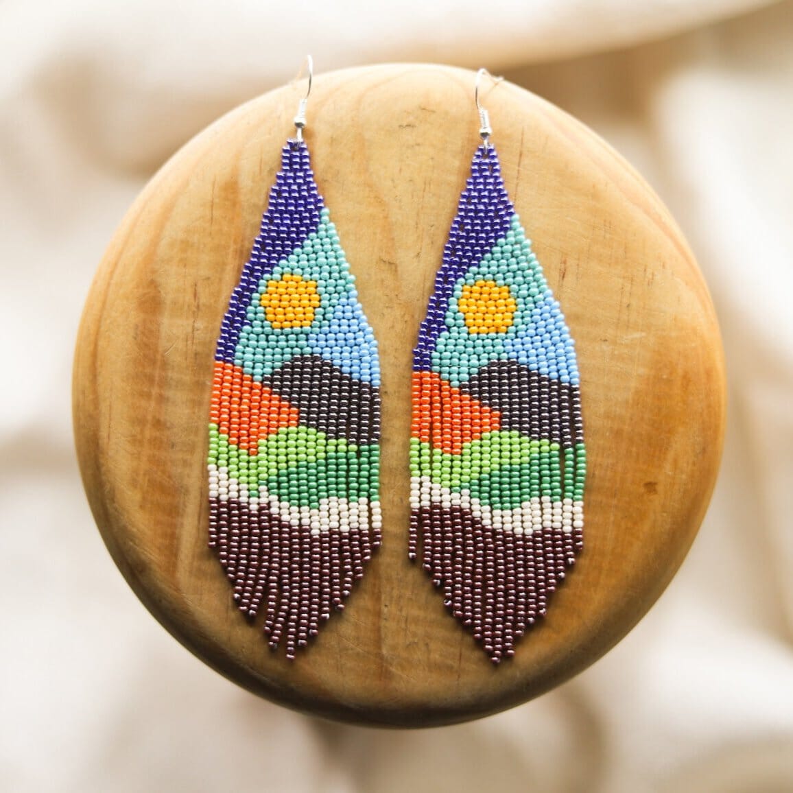 Embrace the beauty of the mountains with the Sierra Nevada beaded earrings, handmade to capture the stunning essence of nature’s highlands. Crafted with intricate beading in earthy tones of brown, cream, and deep green, these earrings reflect the rugged landscapes and rich forests of the Sierra Nevada mountains. The design evokes the spirit of the wild, where the earth meets the sky, symbolizing strength, tranquility, and timeless beauty. Each bead is carefully threaded by hand, ensuring a unique, native-inspired piece of wearable art. Perfect for those who appreciate the beauty of handmade, beaded jewelry, the Sierra Nevada earrings make a bold yet elegant statement.