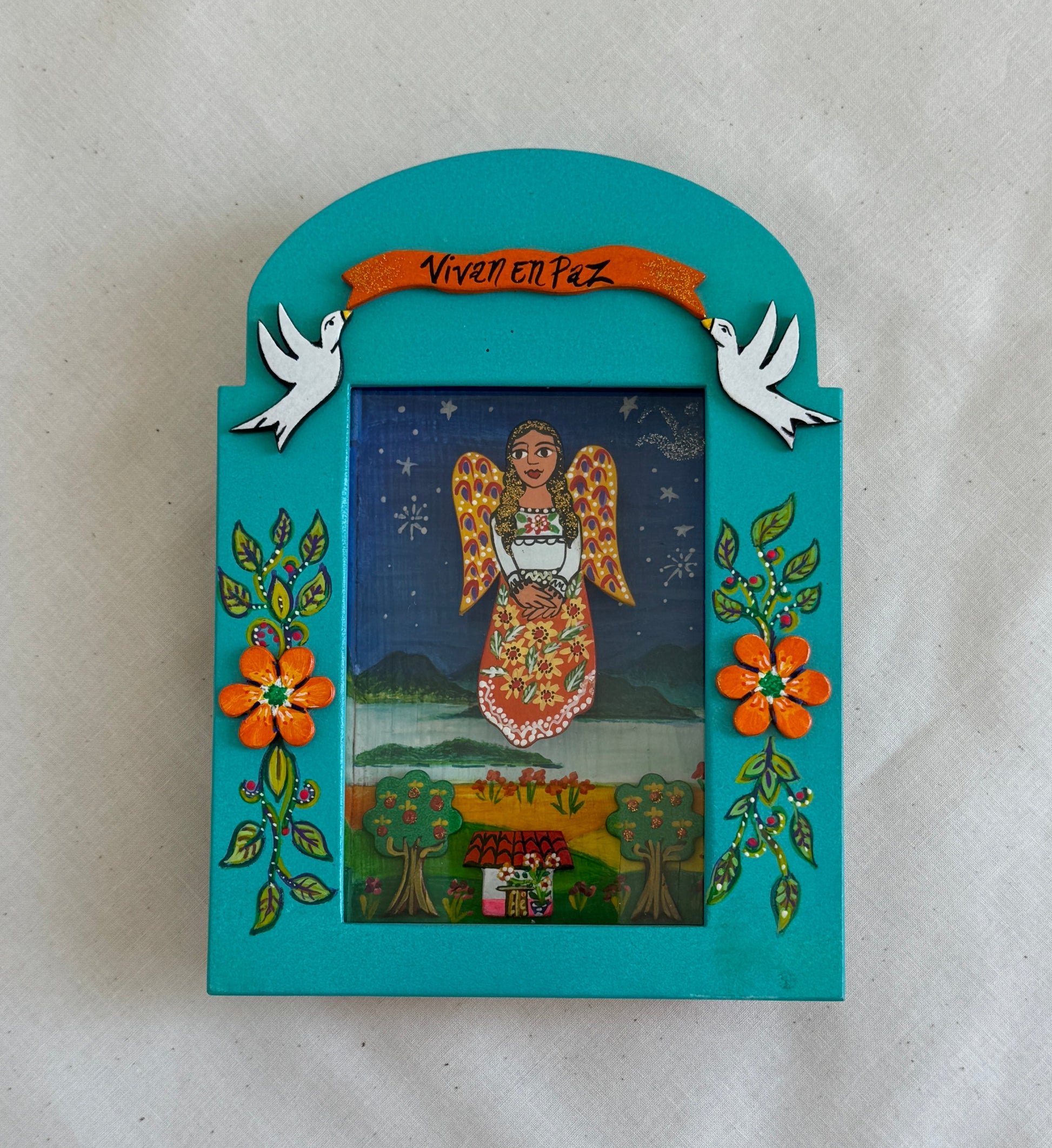 This handcrafted wooden nicho from Pátzcuaro, Michoacán, features a beautifully painted guardian angel, blooming flowers, and peaceful doves. The heartfelt phrase “Vivan en Paz” (“Live in peace”) makes it a meaningful piece to honor the memory of loved ones or add a spiritual, colorful touch to your home decor.